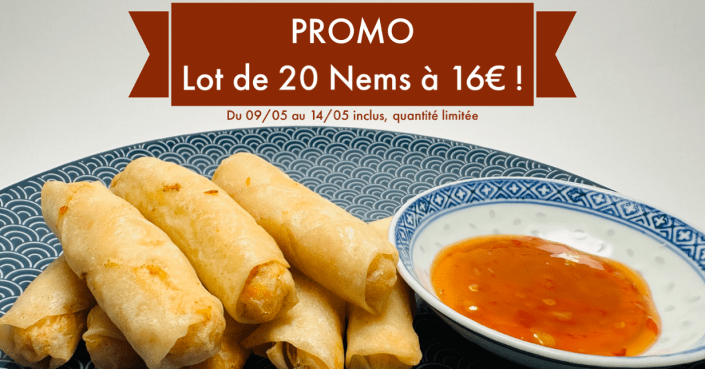 Les nems sont de retour ! Pour fêter ça, nous vous proposons une promotion : le lot de 20 nems à 16€. Valable du mardi 09 mai 2023 au dimanche 14 mai 2023 inclus. Évidement, ils sont toujours faits maison avec du poulet halal. Quantité limité.