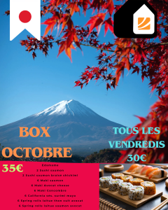 par Uchi BentoCe mois d’octobre, on vous propose une nouvelle box ! Elle contient une portion d’edamame, 2 sushi saumon, 2 sushi saumon braisé shichimi, 6 maki saumon, 6 maki avocat cheese, 6 maki concombre, 6 california sésames surimi… Lire la suite : Nouveauté : La box d’octobre - Nouveauté : Les Spring Rolls Maki
