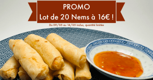 par Uchi BentoLes nems sont de retour ! Pour fêter ça, nous vous proposons une promotion : le lot de 20 nems à 16€. Valable du mardi 09 mai 2023 au dimanche 14 mai 2023 inclus. Évidement, ils sont… Lire la suite : Promo : Lot de 20 nems à 16€ - Fermeture exceptionnelle : samedi 22 Avril 2023