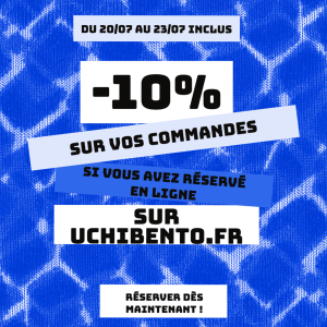par Uchi BentoDu jeudi 20 juillet au dimanche 23 juillet 2023 inclus, si vous avez réservé depuis le site, vous bénéficierez d’une réduction de 10% sur vos commandes. N’attendez plus ! - Nouveauté : Les chips de crevettes