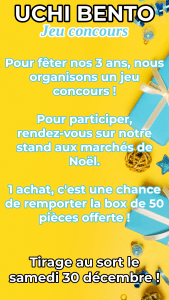 par Uchi BentoPour fêter nos 3 ans, nous vous proposons un jeu concours ! Pour participer, rendez-vous sur notre stand aux marchés de Noël. Un achat, c’est une chance de gagner la box de 50 pièces offertes. On vous… Lire la suite : Anniversaire : Jeu concours - Marché de Noël Torcy 2023