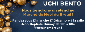 par Uchi BentoNous sommes très heureux de vous annoncer notre participation au Marché de Noël de la ville du Breuil. Il se tiendra le dimanche 17 Décembre 2023 de 10h00 à 18h00 à la salle Jean-Baptiste Dumay. Nous tiendrons… Lire la suite : Marché de Noël Breuil 2023 - Anniversaire : Jeu concours