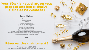 par Uchi BentoPour fêter le nouvel an, on vous propose une box exclusive, pleine de nouveautés ! Cette box à 80€ est composée de 60 pièces : 2 sushi saumon2 sushi crevette2 gunkan6 maki avocat/cheese6 flocon roll saumon/avocat6 flocon… Lire la suite : Nouvel An : Box exclusive - Marché de Noël Breuil 2023