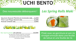 par Uchi BentoDe la nouveauté au menu : Les Spring Rolls Maki ! C’est un maki avec sa garniture, son riz vinaigré enroulé dans une feuille de laitue et une feuille de riz. Vous trouverez différentes versions : avocat/cheese,… Lire la suite : Nouveauté : Les Spring Rolls Maki - Salon des entrepreneuses